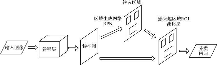 1 Faster R-CNN基本原理 1.1 Faster R-CNN整体结构卷积神经网络因其参数共享、局部连接和自主学习等优点,具有强大的非线性表达能力,在计算机视觉、自然语言处理等领域得以广泛应用[7-8]。Faster R-CNN是2015年被提出的基于区域推荐和卷积神经网络,可以进行端到端学习的目标检测框架,算法精度和效率较高,已逐渐应用于图像识别与检测领域[9-10]。
