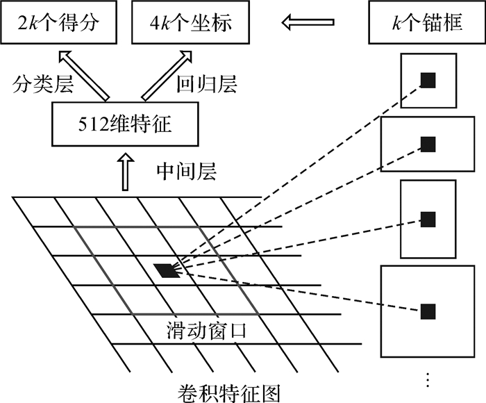 RPN是一个全卷积神经网络,包含1个卷积层和2个全连接层,采用滑动窗口的方式生成候选区域框,其结构如图 2所示。RPN首先将经过卷积层得到的特征图作为输入,采用滑动窗口进行扫描,然后经过中间层将特征图上大小为n×n(n=3)的窗口映射到一个低维特征向量(如VGG16为512维),通过全连接层-分类层与回归层,判断滑动窗口区域内特征图像的分类,并得到该区域的具体坐标。当滑动窗口在卷积特征图上滑动时,每次滑动得到k个锚框,并输出2k个得分及4k个坐标值。