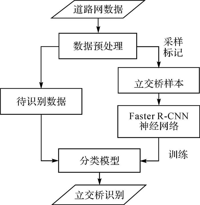 Faster R-CNN已被广泛应用于目标检测领域,该模型通过大量样本的训练,能够学习不同类别目标的深层次特征,从而完成目标的识别分类,并进行准确定位,因此本文将Faster R-CNN模型应用于立交桥的自动识别。具体流程如图 4所示,首先对道路数据进行预处理,主要包括数据清理、矢栅转换等;然后采集并标记立交桥样本,利用Faster R-CNN深度神经网络模型进行训练,得到分类模型;最后利用训练好的模型自动识别道路网中的立交桥,并利用矩形框进行定位标记。