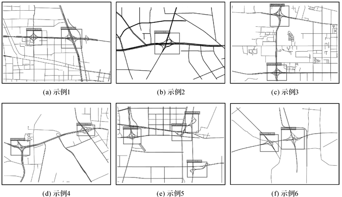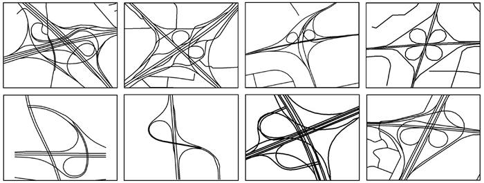 由于目前缺乏公开的立交桥样本数据库,本文利用ArcGIS软件从道路数据中人工采集样本,同时用谷歌影像进行验证,得到满足试验要求的样本库。Faster R-CNN是针对栅格数据进行训练的,在矢栅转换过程中,为了保持采集的立交桥样本在视觉上的清晰性,道路符号的宽度采用2像素。同时,在样本采集的过程中,采集的样本要符合人类的空间认知,在视觉上具有良好的可分辨性,部分立交桥样本如图 5所示。