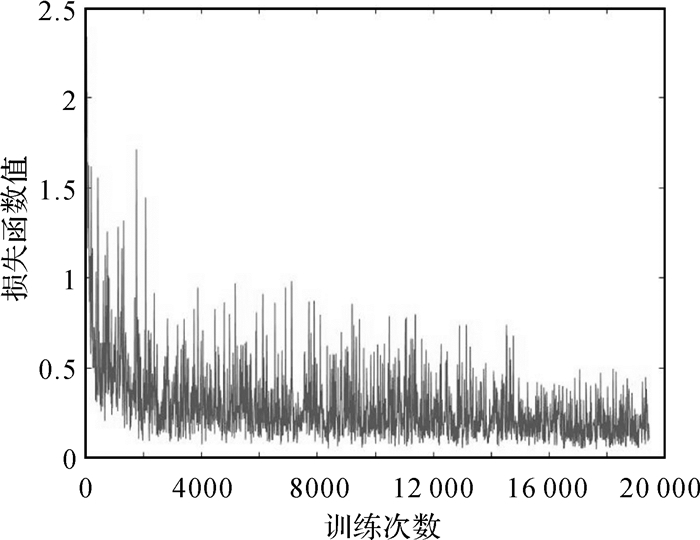 在模型训练的过程中,根据样本数据的特点,对Faster R-CNN模型的参数进行了修改,包括:采用经典的VGG16网络提取图片的卷积特征,权重衰减系数为0.000 5,学习率为0.001,IoU阈值为0.7,训练次数为4万次,动量值为0.9,每批次训练样本值(batch_size)为24。模型在训练过程中得到的损失函数值如图 6所示,随着训练次数的增加,模型逐渐收敛,训练误差逐渐减小,拟合效果较好。