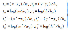 (5) 式中,x、y、w、h分别为候选区域框的中心坐标及宽度和高度;xa、x*分别为锚框、真实区域边框的x坐标(y、w、h同样适用)。